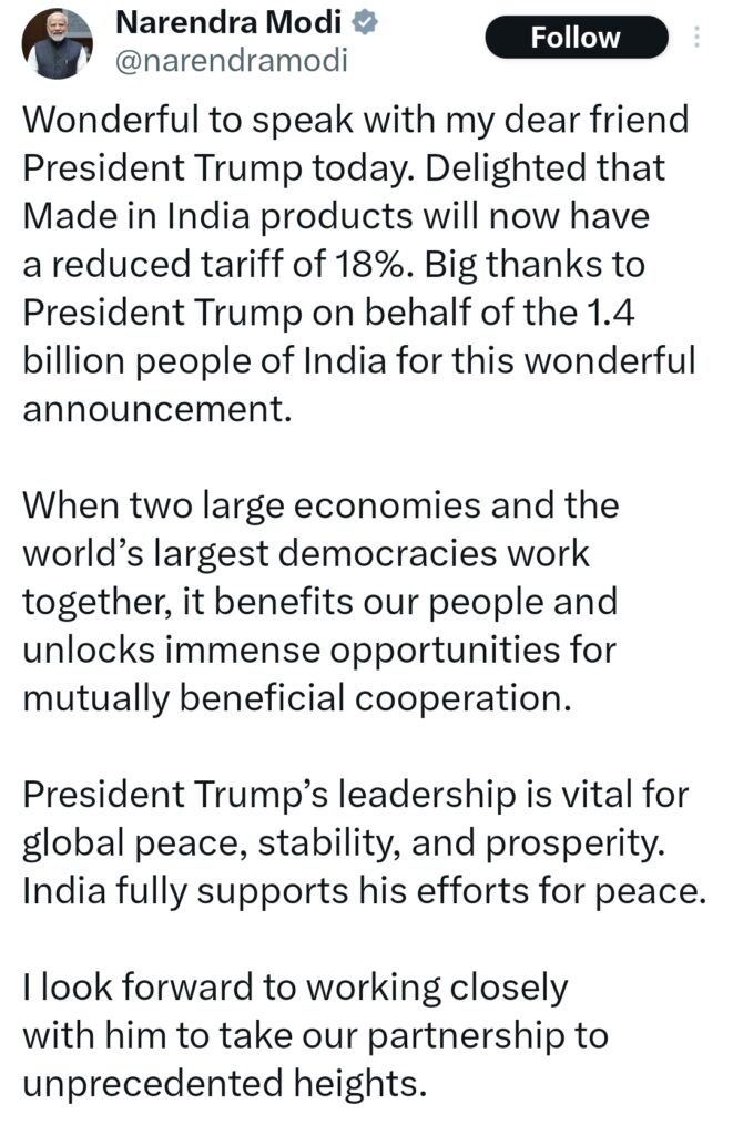 “பிரதமர் மோடி அவர்கள் மீதான நட்பு மற்றும் மரியாதை நிமித்தமாகவும், அவருடைய வேண்டுகோளுக்கு இணங்கவும், அமெரிக்காவிற்கும் இந்தியாவிற்கும் இடையிலான வர்த்தக ஒப்பந்தத்திற்கு நாம் உடனடியாகச் சம்மதம் தெரிவித்துள்ளோம். இதன்படி, இந்தியாவிடமிருந்து வசூலிக்கப்படும் பரஸ்பர வரி (Reciprocal Tariff) 25 வீதத்திலிருந்து 18 வீதமாகக் குறைக்கப்படும்,” என்று ட்ரம்ப் தனது 'ட்ரூத் சோஷியல்' (Truth Social) தளத்தில் பதிவிட்டுள்ளார்.