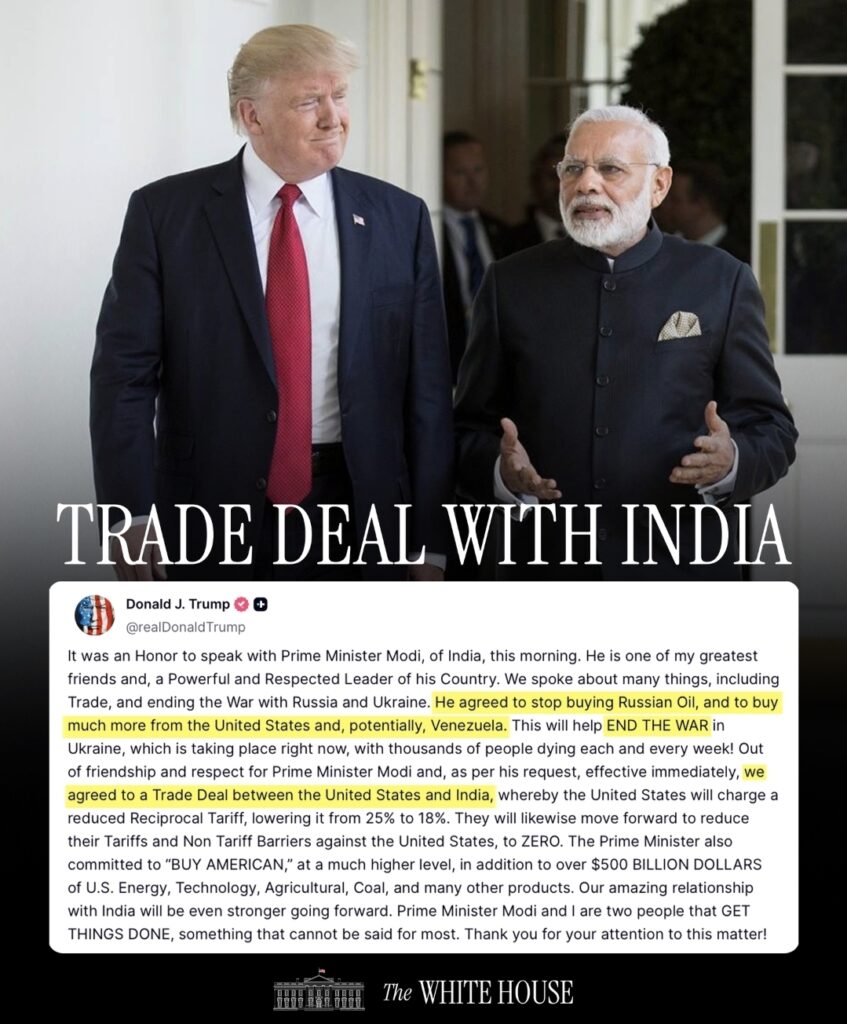 ரஷ்யாவிடம் இருந்து எண்ணெய் வாங்குவதை நிறுத்த இந்தியா ஒப்புக்கொண்டுள்ளதாக ட்ரம்ப் தனது பதிவில் கோரியுள்ளார். இதற்குப் பதிலாக, ரஷ்ய எண்ணெய் கொள்முதல் காரணமாக இந்தியப் பொருட்களுக்கு விதிக்கப்பட்டிருந்த மேலதிக 25 வீத வரியை அமெரிக்கா நீக்கும் என்று வெள்ளை மாளிகை அதிகாரி ஒருவர் உறுதிப்படுத்தியுள்ளார்.