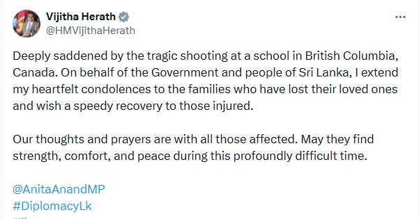 இது குறித்து எக்ஸில் பதிவிட்டுள்ள அமைச்சர் விஜித ஹேரத், கனடாவின் பிரிட்டிஷ் கொலம்பியாவில் உள்ள ஒரு பாடசாலையில் நடந்த துயரமான துப்பாக்கிச் சூடு சம்பவத்தால் மிகவும் வருத்தமடைந்தேன்.