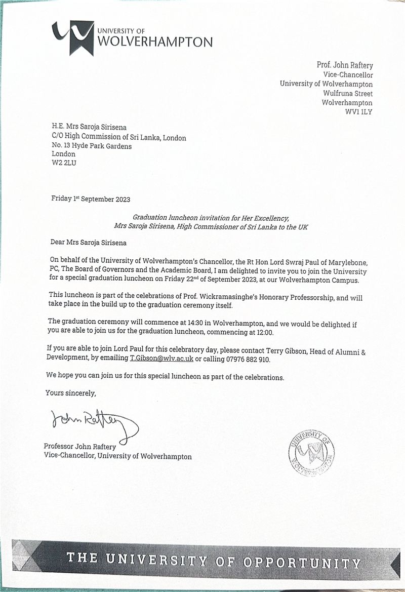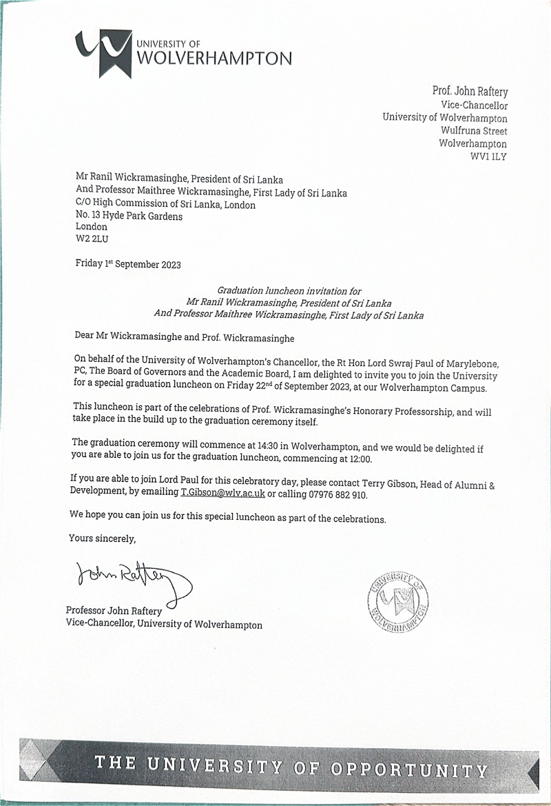 எனினும், எமக்குக் கிடைத்துள்ள வூல்வர்ஹாம்டன் பல்கலைக்கழகத் துணைவேந்தர் பேராசிரியர் ஜொன் ரஃப்டரி (Prof. John Raftery) மூலம் 2023 செப்டம்பர் 01ஆம் திகதியிடப்பட்டு அனுப்பப்பட்ட உத்தியோகபூர்வ அழைப்பிதழ் மற்றும் நிகழ்வு நிரல் (Agenda) அந்த வாதத்தை முழுமையாக முறியடிக்கிறது.