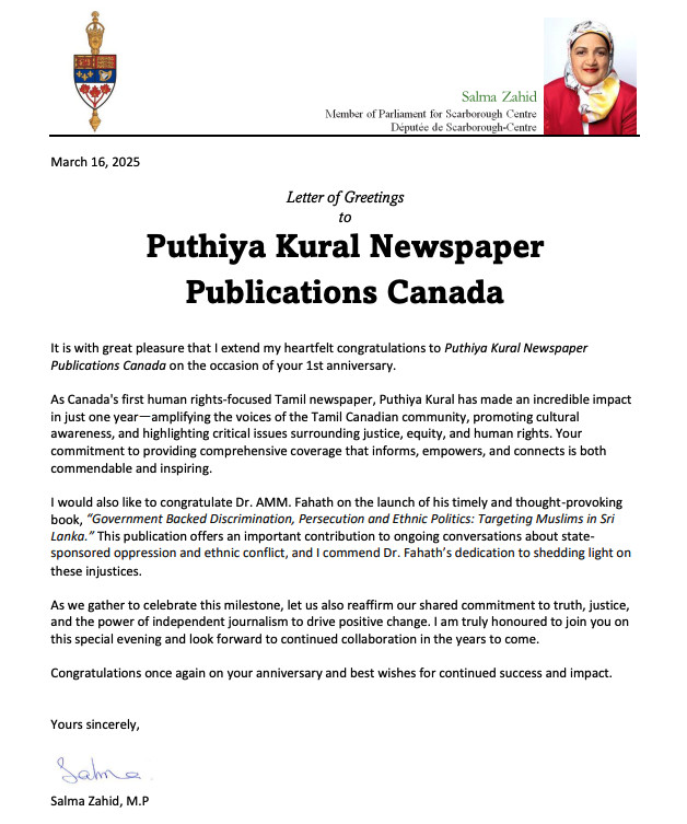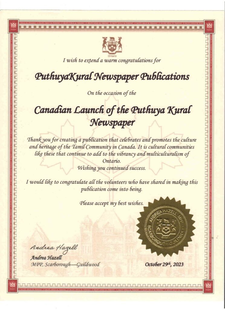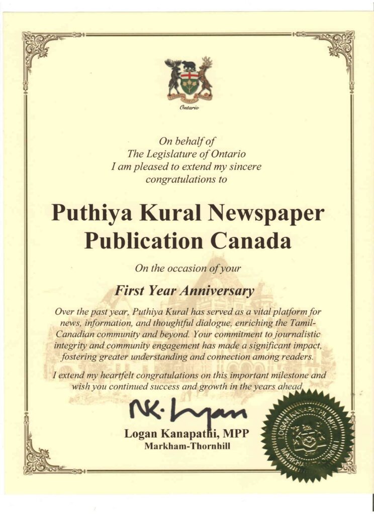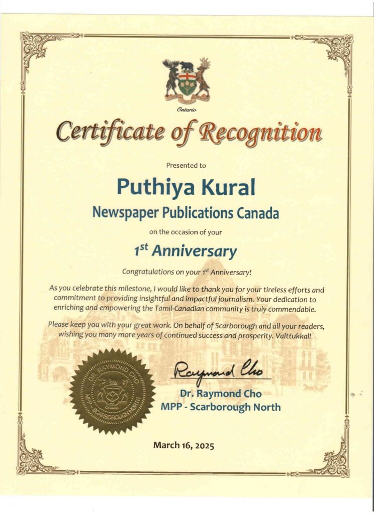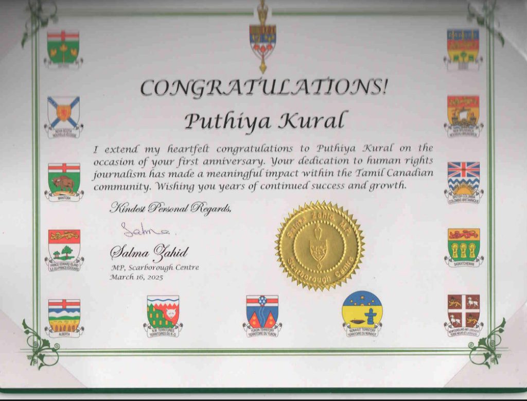 Puthiya Kural Newspaper proudly marks successful year of serving the Tamil-speaking community in Canada and around the world. In a short span of time, our commitment to truth-based journalism, community service, and advocacy for affected Sri Lankan Tamil people has earned us significant recognition.